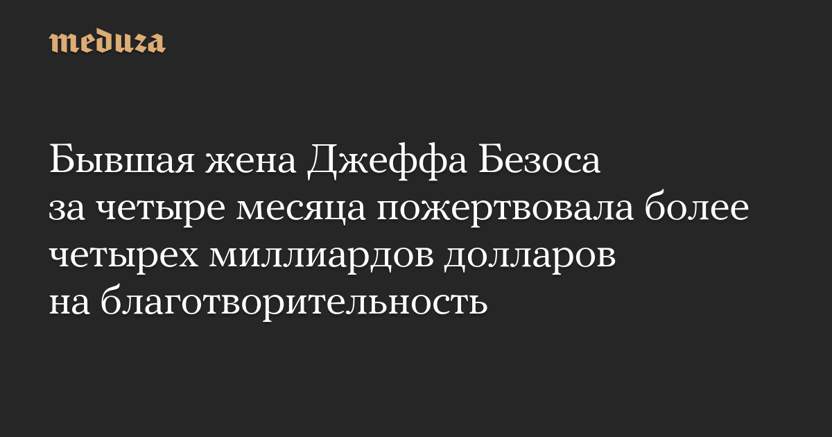 Бывшая жена основателя Amazon Джеффа Безоса, писательница Маккензи Скотт сообщила в блоге на Medium, что за последние четыре месяца пожертвовала 4 158 500 000 долларов на благотворительность.