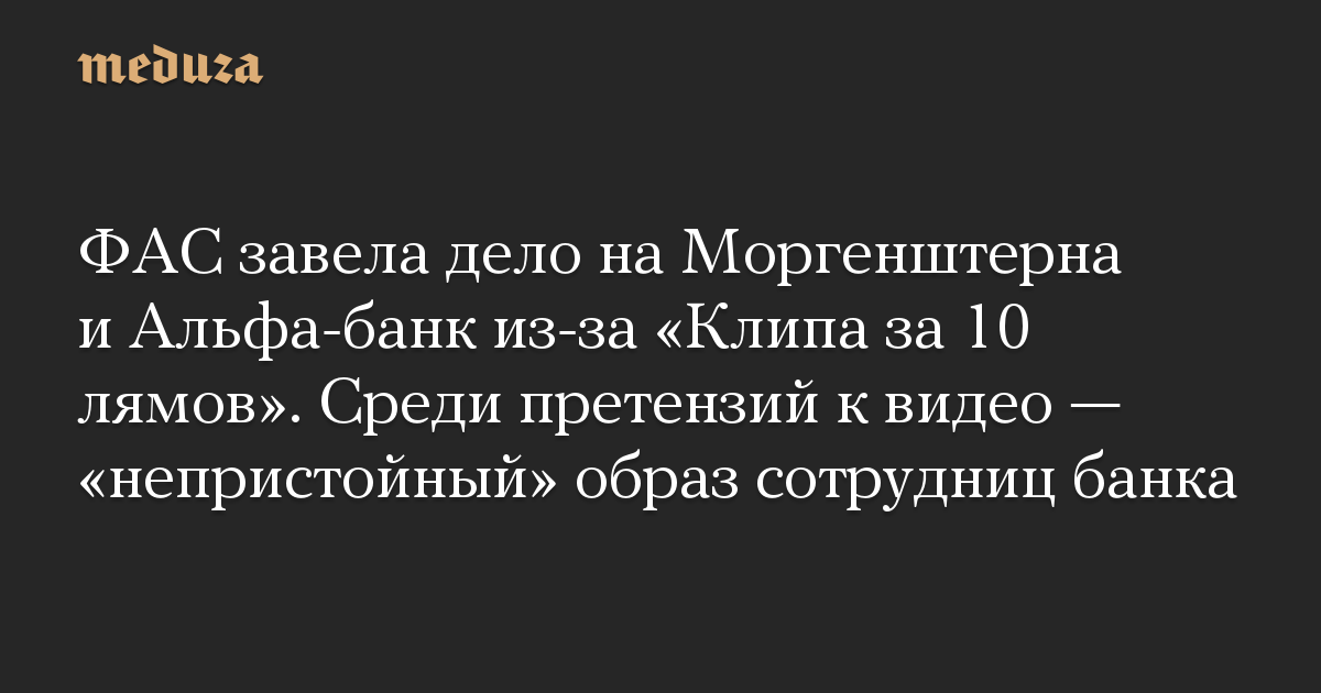 ФАС завела дело на Моргенштерна и Альфа-банк из-за «Клипа за 10 лямов». Среди претензий к видео — «непристойный» образ сотрудниц банка