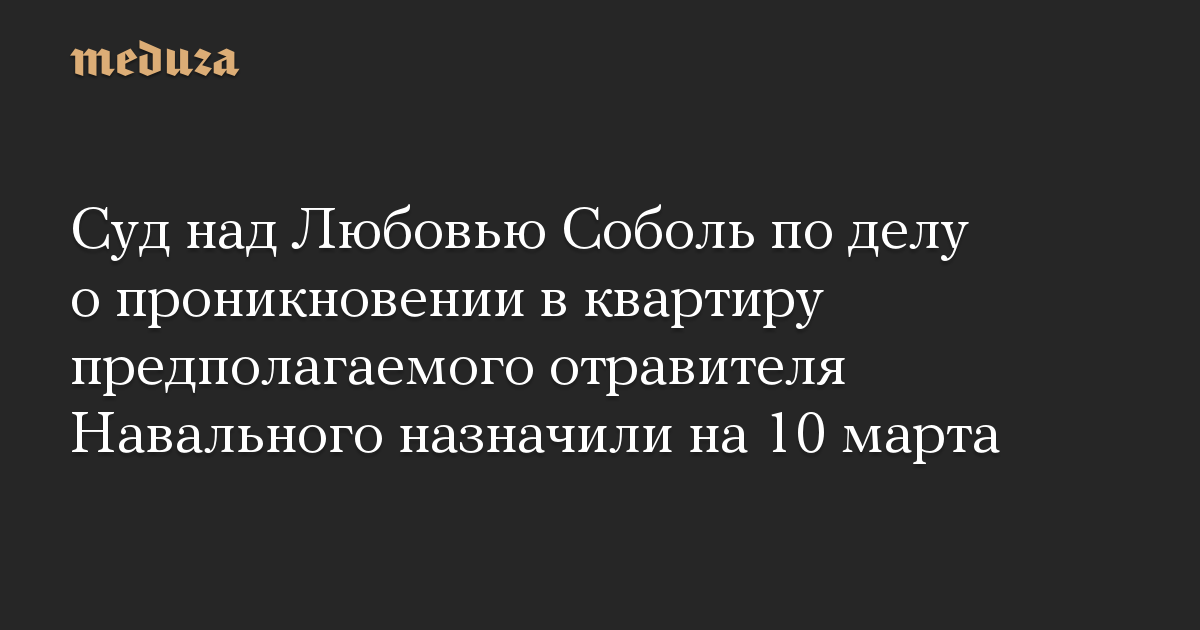Рассмотрение уголовного дела в отношении сотрудницы ФБК Любови Соболь, обвиняемой в нарушении неприкосновенности жилища, пройдет 10 марта в 10:00 на выездном заседании в Перовском суде Москвы. Об этом сообщается в телеграм-канале московских судов общей юрисдикции.