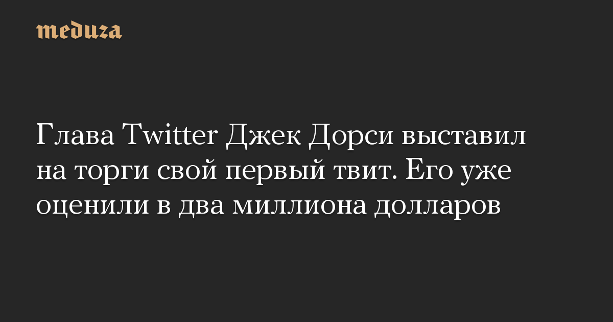 Глава и один из основателей социальной сети Twitter Джек Дорси выставил на продажу свой первый твит, опубликованный 21 марта 2006 года. 5 марта он разместил на своей странице в соцсети сообщение со ссылкой на платформу Valuables, где торгуют твитами.