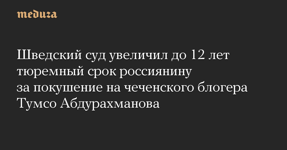 Апелляционный суд Швеции ужесточил приговор россиянину, признанному виновным в покушении на чеченского блогера Тумсо Абдурахманова в городе Евле в феврале 2020 года. Срок его наказания увеличен с 10 до 12 лет лишения свободы.