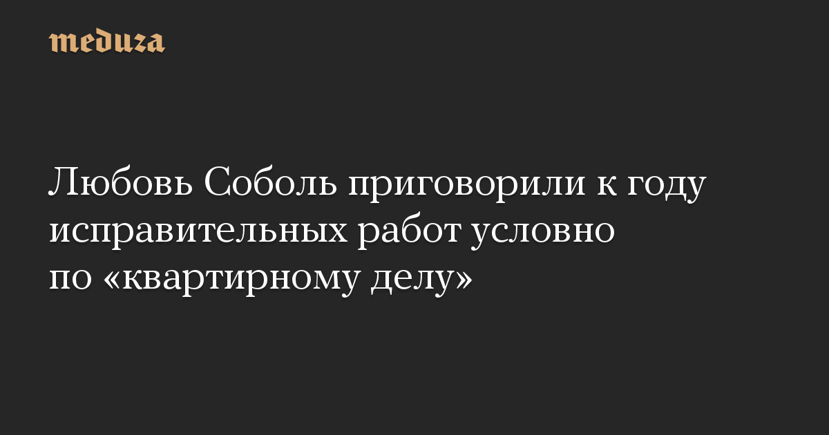 Юрист ФБК Любовь Соболь признана виновной по уголовному делу о нарушении неприкосновенности жилища. Ей назначен условный срок — один год исправительных работ с удержанием 10% заработной платы в доход государства. Об этом сообщает корреспондент «Медузы» из Перовского суда Москвы, где оглашали приговор по «квартирному делу».