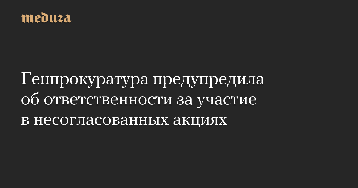 Поправка. Первоначально в этой новости говорилось, что Генпрокуратура предупредила об уголовной ответственности за участие в несогласованных акциях и за призывы к участию в них. В действительности речь идет об административной ответственности. Уголовное наказание предусмотрено за призывы к массовым беспорядкам. «Медуза» приносит извинения за допущенную ошибку.