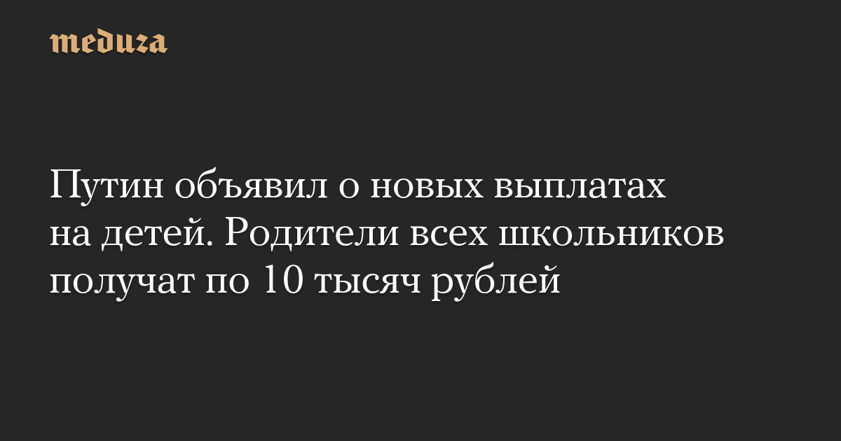 Так, в середине августа россияне получат единовременную выплату в размере 10 тысяч рублей на каждого ребенка, учащегося в школе. Путин предложил также распространить выплату на будущих первоклассников, которые пойдут в школу осенью 2021 года.