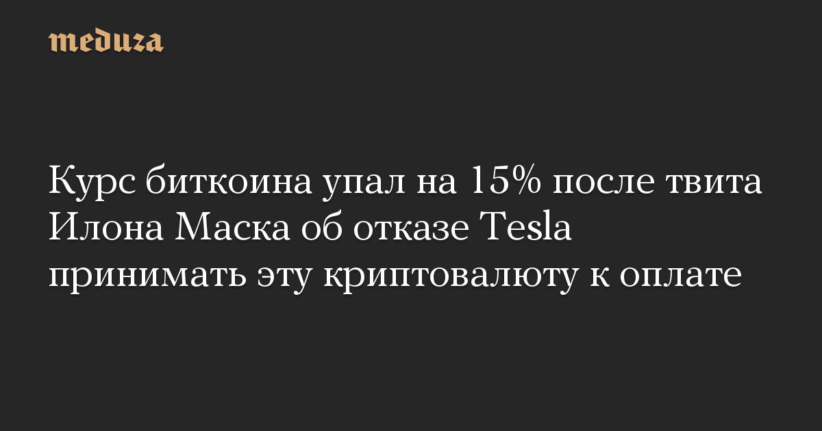 Илон Маск написал в твиттере, что Tesla перестанет принимать биткоин как средство оплаты, потому что компания обеспокоена «быстро растущим использованием ископаемого топлива для майнинга биткоина и транзакций». Маск отметил, что Tesla может принять другие криптовалюты, если они будут менее энергоемкие. Также компания не собирается продавать ранее купленные биткоины.