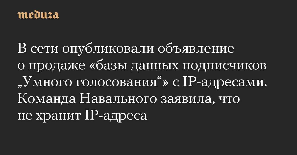 В сети опубликовали объявление о продаже «базы данных подписчиков „Умного голосования“» с IP-адресами. Команда Навального заявила, что не хранит IP-адреса