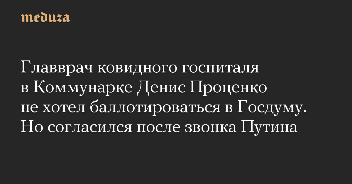 Главврач ковидного госпиталя в Коммунарке Денис Проценко не хотел баллотироваться в Госдуму. Но согласился после звонка Путина