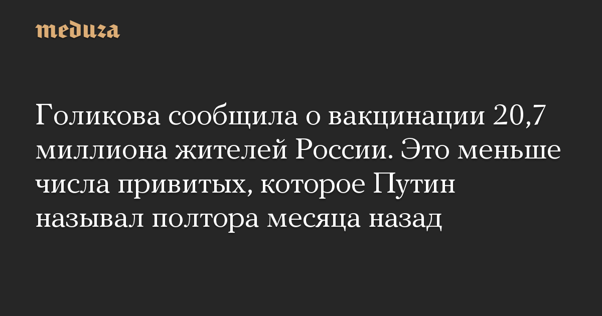 Голикова сообщила о вакцинации 20,7 миллиона жителей России. Это меньше числа привитых, которое Путин называл полтора месяца назад