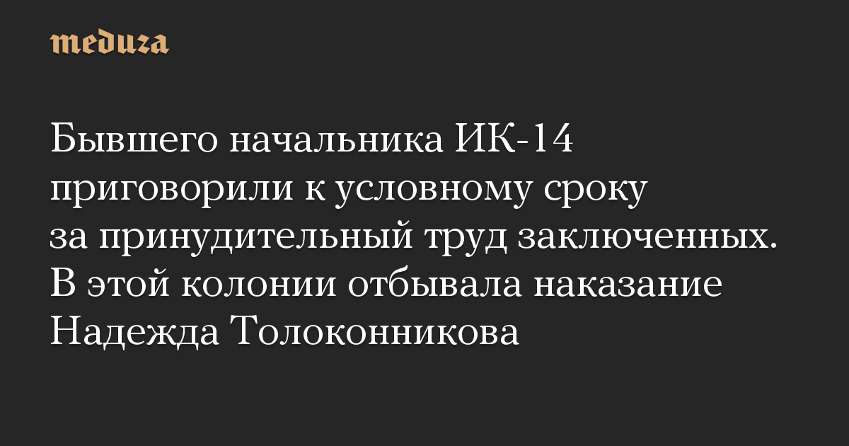 Бывший начальник исправительной колонии № 14 Юрий Куприянов приговорен к двум годам колонии условно за использование принудительного труда заключенных. Приговор, сообщили «Медузе» в «Зоне права», вынес Зубово-Полянский райсуд Мордовии.