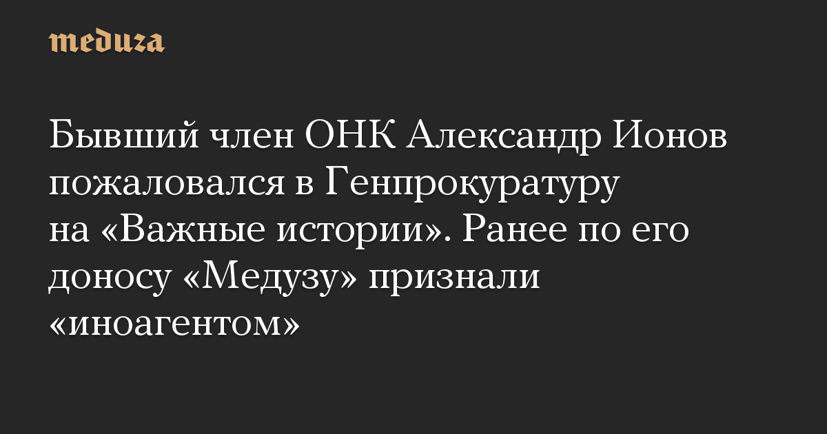 Бывший член ОНК Александр Ионов пожаловался в Генпрокуратуру на «Важные истории». Ранее по его доносу «Медузу» признали «иноагентом»