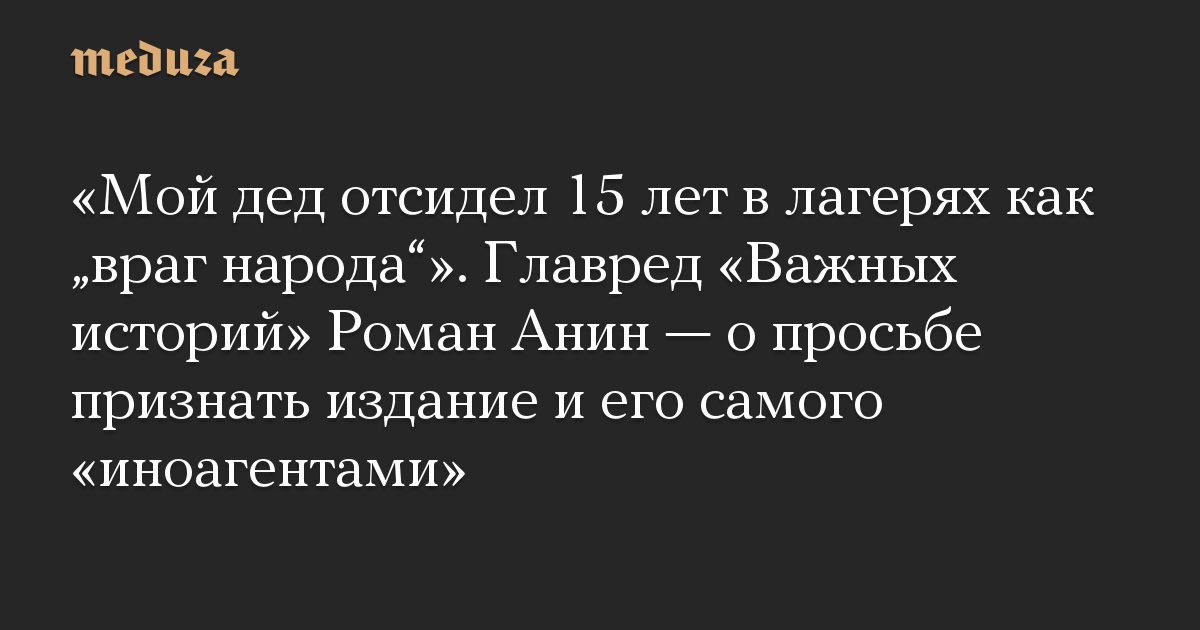 «Мой дед отсидел 15 лет в лагерях как „враг народа“». Главред «Важных историй» Роман Анин — о просьбе признать издание и его самого «иноагентами»