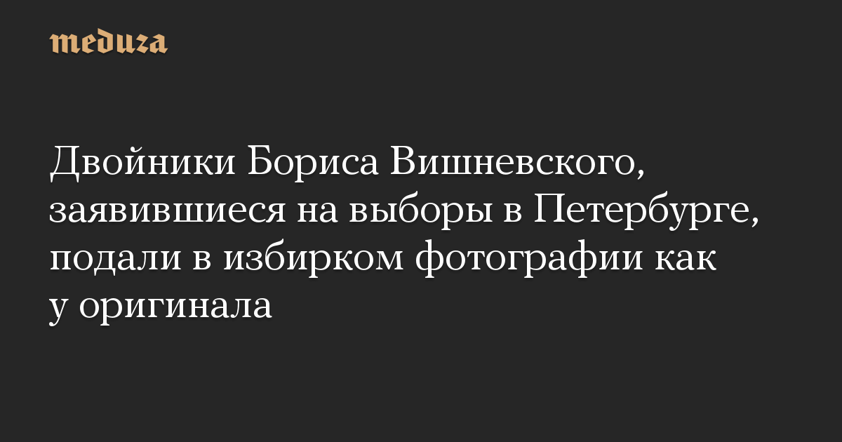 В июле стало известно, что на выборы в Петербурге свои кандидатуры выдвинули оппозиционер Борис Вишневский и два его тезки, сменившие имена и фамилии. Одного из двойников раньше звали Виктор Быков, второго — Алексей Шмелев.