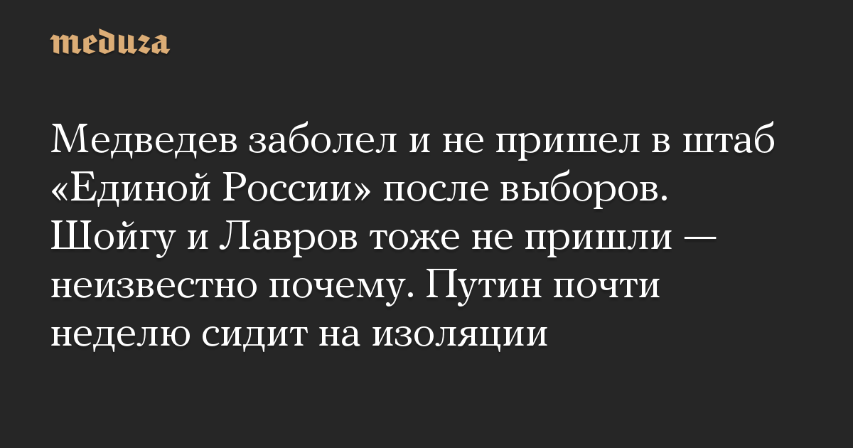 Медведев заболел и не пришел в штаб «Единой России» после выборов. Шойгу и Лавров тоже не пришли — неизвестно почему. Путин почти неделю сидит на изоляции