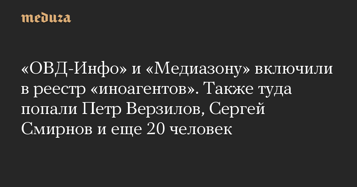«ОВД-Инфо» и «Медиазону» включили в реестр «иноагентов». Также туда попали Петр Верзилов, Сергей Смирнов и еще 20 человек