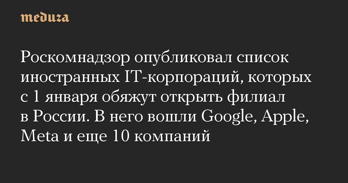Роскомнадзор опубликовал список иностранных IT-корпораций, которых с 1 января обяжут открыть филиал в России. В него вошли Google, Apple, Meta и еще 10 компаний