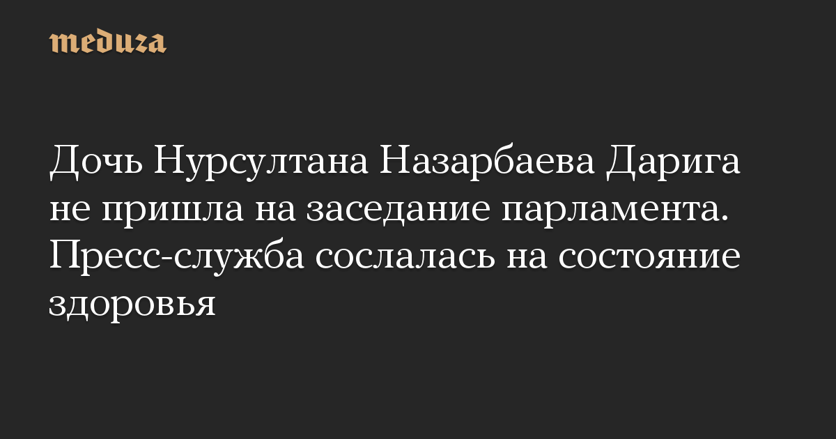Дарига Назарбаева — старшая дочь первого президента Казахстана — не появилась на пленарном заседании нижней палаты парламента, депутатом которого она является. «Она на больничном», — сообщили «Интерфаксу» в пресс-службе парламента, не став уточнять детали.
