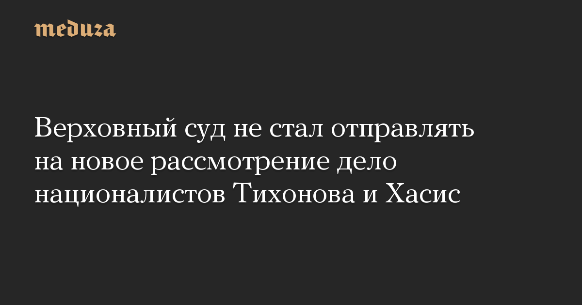 Верховный суд России не стал отправлять на новое рассмотрение в суд первой инстанции дело националистов Никиты Тихонова и Евгении Хасис, осужденных за убийство адвоката Станислава Маркелова и журналистки «Новой газеты» Анастасии Бабуровой. Об этом сообщает корреспондент «Новой газеты» из зала суда.