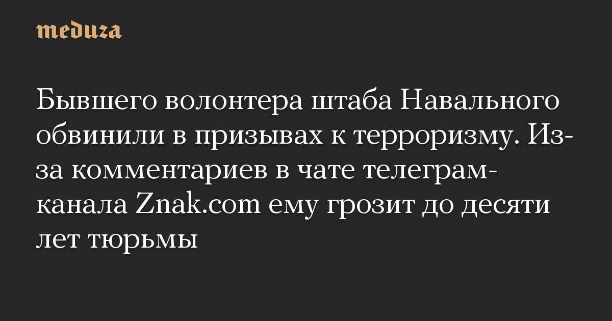 Бывшего волонтера штаба Навального обвинили в призывах к терроризму. Из-за комментариев в чате телеграм-канала Znak.com ему грозит до десяти лет тюрьмы