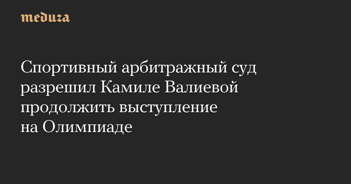 Российская фигуристка Камила Валиева сможет выступить в одиночных соревнованиях на Олимпиаде в Пекине. Об этом говорится в решении (.pdf) Спортивного арбитражного суда (CAS), рассмотревшего апелляцию по делу Валиевой.