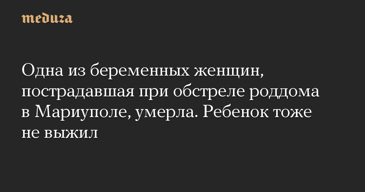 В Мариуполе умерла одна из беременных женщин, пострадавших при обстреле родильного отделения городской больницы № 3. Ее ребенок тоже не выжил. Об этом сообщили журналистка «Голоса Америки» Ася Долина и издание Associated Press.