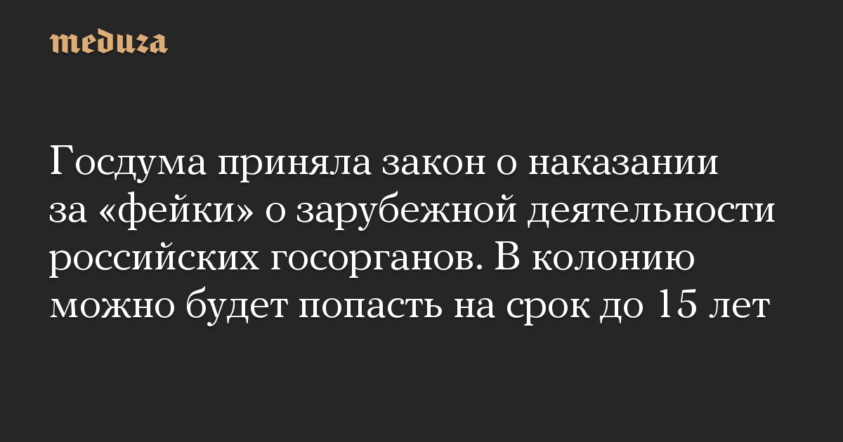 Госдума приняла закон о наказании за «фейки» о зарубежной деятельности российских госорганов. В колонию можно будет попасть на срок до 15 лет
