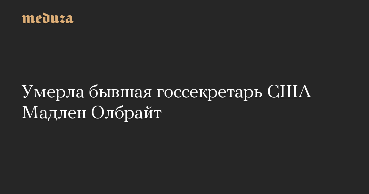 Мадлен Олбрайт — госсекретарь США в 1997-2001 годах, ставшая первой женщиной на этом посту, — умерла в возрасте 84 лет. Об этом пишет NBC News со ссылкой на заявление семьи Олбрайт.