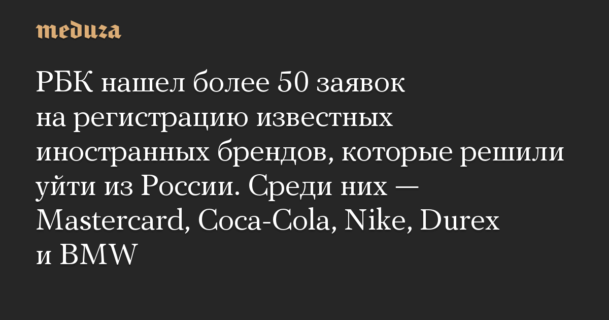 РБК нашел более 50 заявок на регистрацию известных иностранных брендов, которые решили уйти из России. Среди них — Mastercard, Coca-Cola, Nike, Durex и BMW