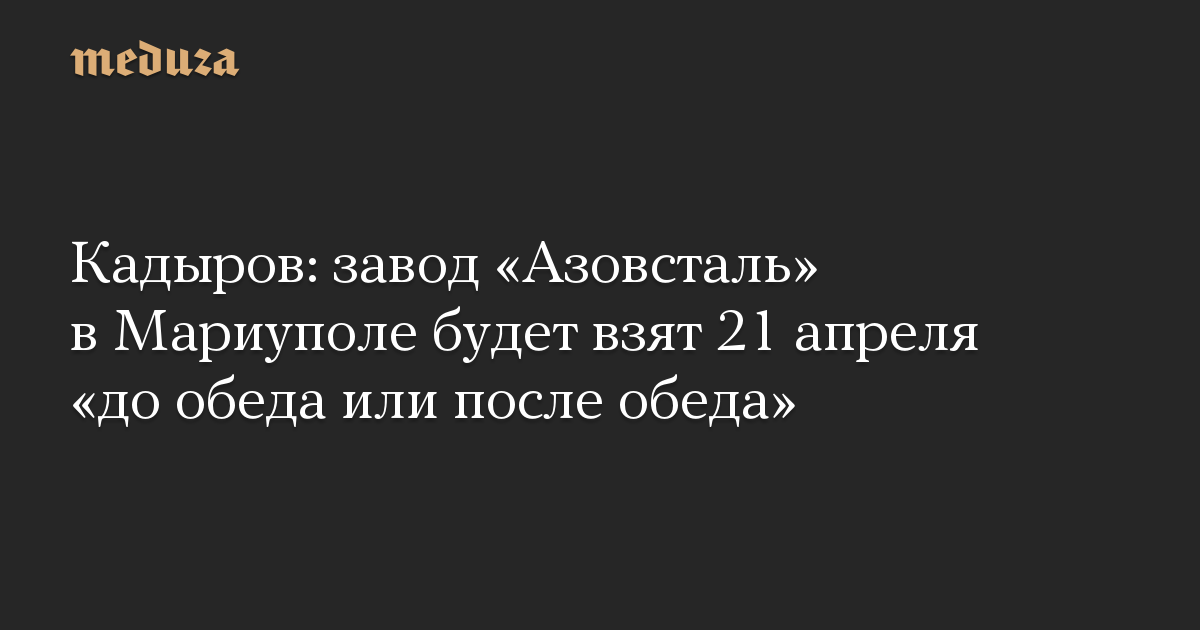 «Завтра, вернее, сегодня уже до обеда или после обеда „Азовсталь“ будет полностью под контролем Вооруженных сил Российской Федерации. Все готово, стратегия готова, воины готовы, только нужно время», — заявил Кадыров в аудиозаписи, которую выложил в своем телеграм-канале после полуночи 21 апреля.