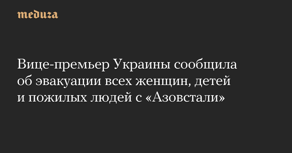 Вице-премьер Украины сообщила об эвакуации всех женщин, детей и пожилых людей с «Азовстали»