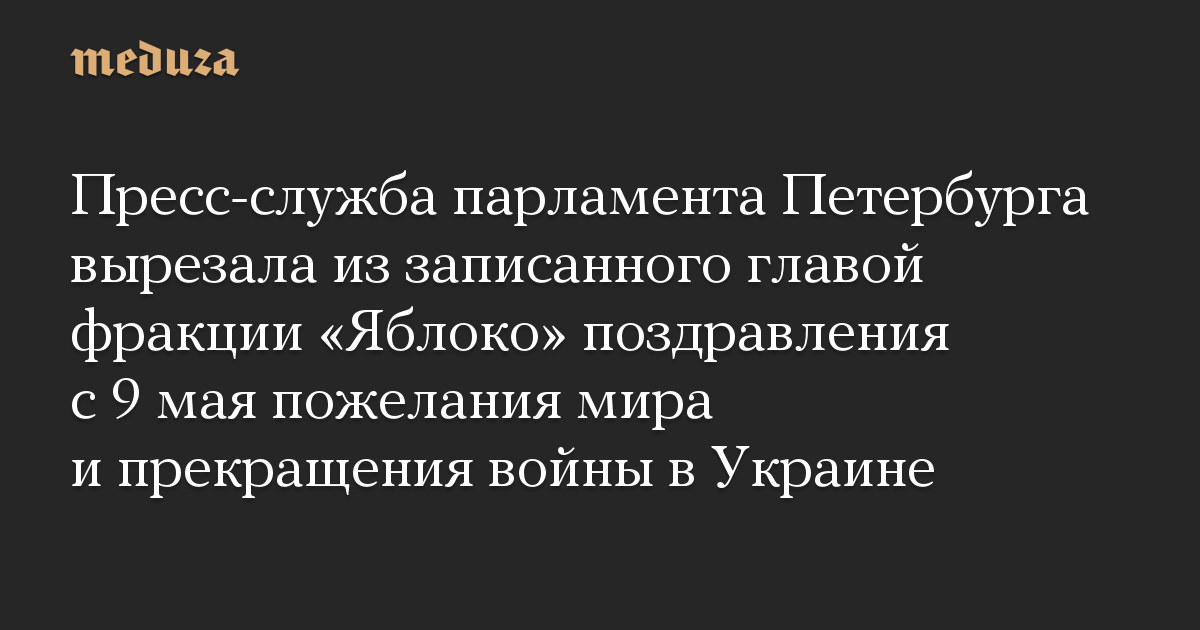 Пресс-служба парламента Петербурга вырезала из записанного главой фракции «Яблоко» поздравления с 9 мая пожелания мира и прекращения войны в Украине