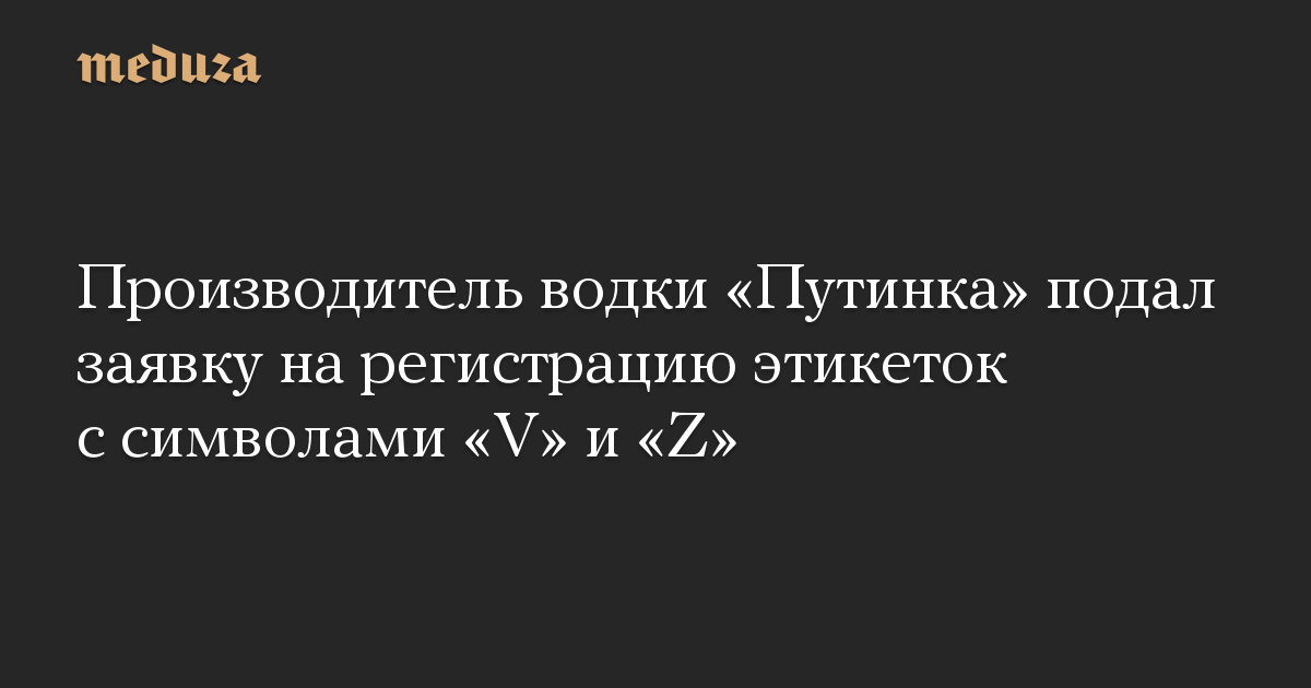 Производитель водки «Путинка», компания «Байкал-Инвест» подала заявку на регистрацию торговых знаков с буквами «Z» и «V», которые стали символами вторжения в Украину. Об этом пишет РБК со ссылкой на реестр Роспатента.