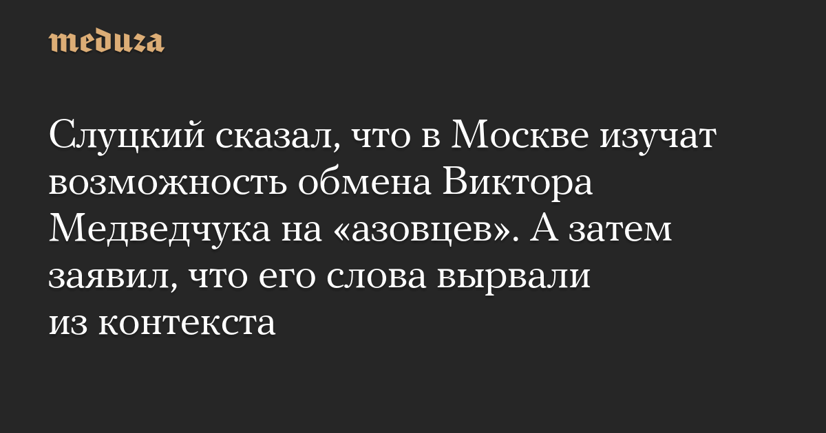 «Мы изучим вопрос возможности обмена Медведчука на „азовцев“. Не мы — ЛДПР, а те люди в Москве, которые имеют такие полномочия», — сказал Слуцкий на пресс-конференции, отвечая на вопрос журналиста «Интерфакса». Политик не уточнил, идет ли речь о бойцах полка «Азов» или обо всех, кто вышел с «Азовстали».