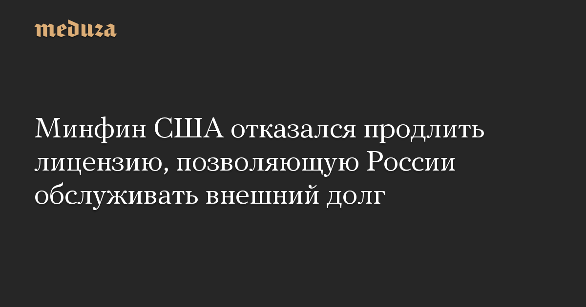 Министерство финансов США объявило, что не будет продлевать лицензию, которая позволяет России производить выплаты для обслуживания внешнего долга. Об этом говорится в уведомлении на сайте ведомства.
