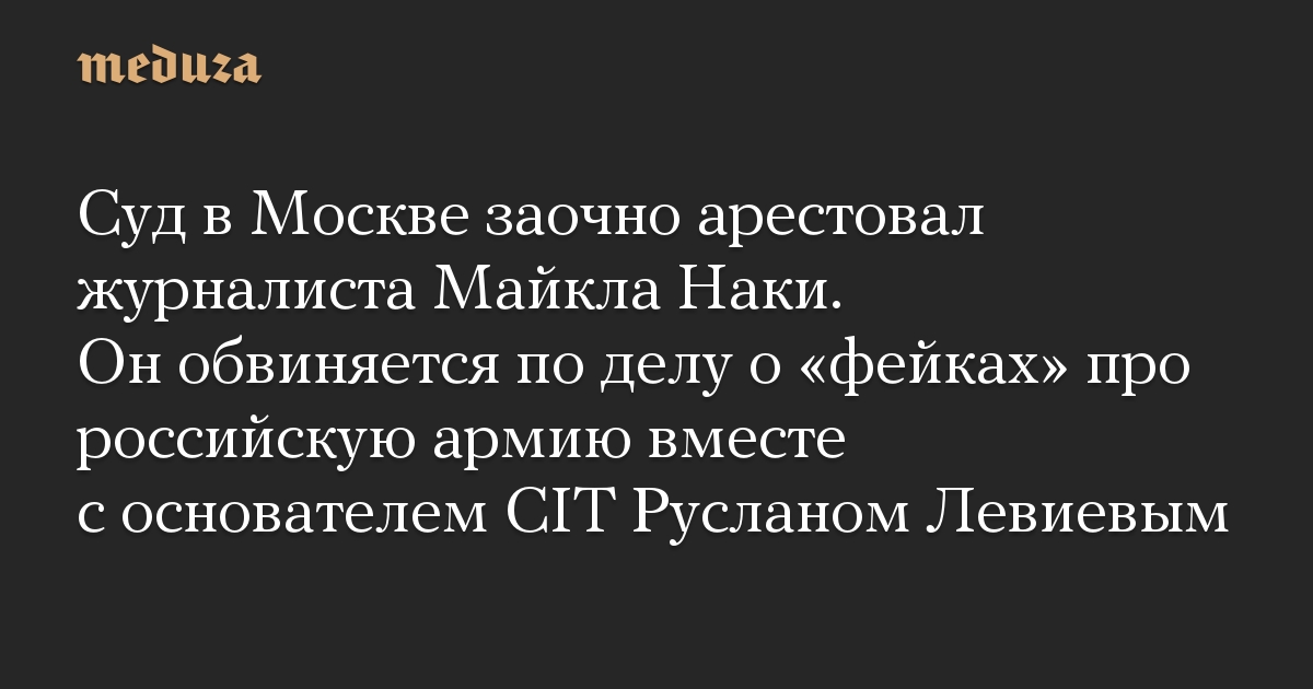 Суд в Москве заочно арестовал журналиста Майкла Наки. Он обвиняется по делу о «фейках» про российскую армию вместе с основателем CIT Русланом Левиевым