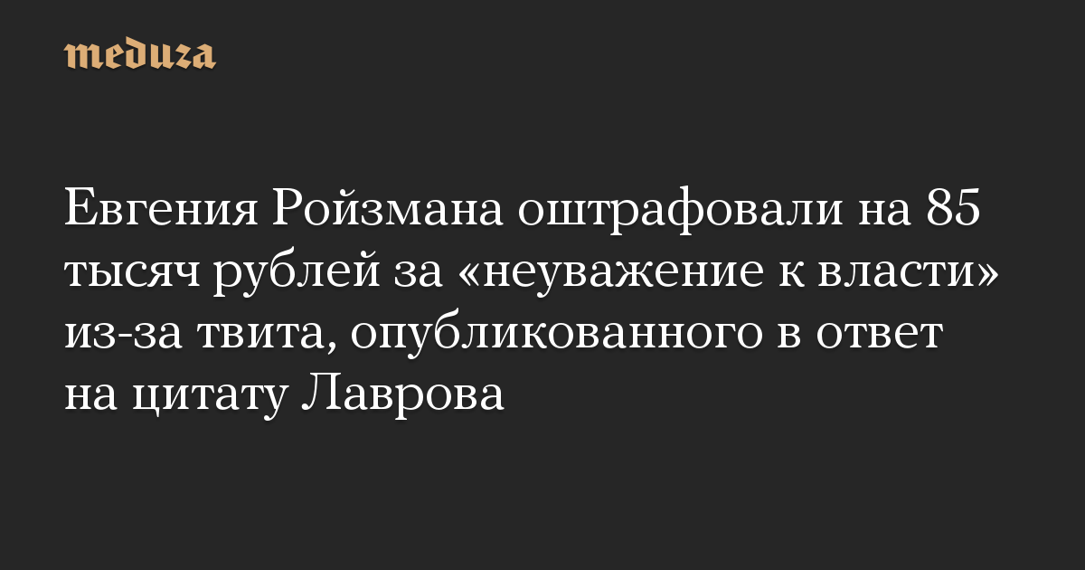 В Екатеринбурге суд оштрафовал бывшего мэра города Евгения Ройзмана на 85 тысяч рублей за «неуважение к власти» из-за его твита, в котором он отреагировал на заявление министра иностранных дел РФ Сергея Лаврова.