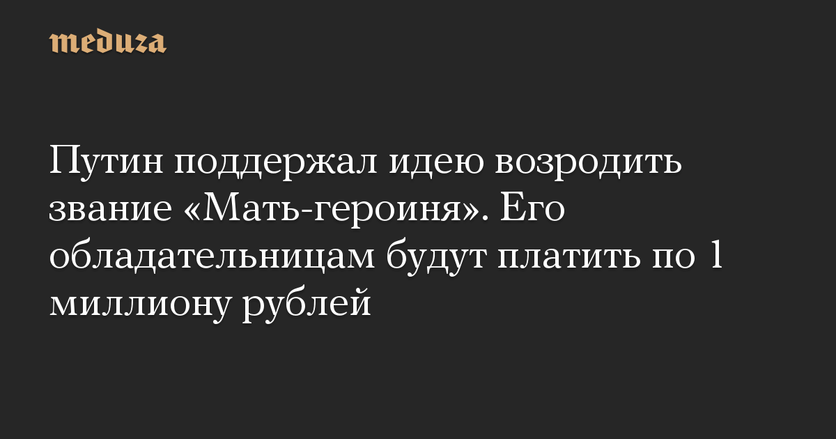 «Тем мамам, которые будут удостоены почетного звания „Мать-героиня“, [будут] единовременно выплачивать миллион рублей», — сказал Путин на встрече с многодетными семьями, награжденными орденом «Родительская слава», которая проходила в День защиты детей.