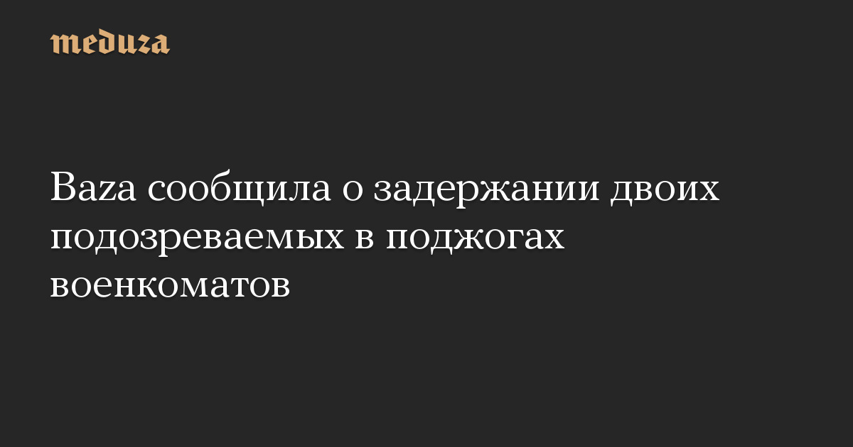 Телеграм-канал Baza сообщил о задержании двоих подозреваемых в поджогах военкоматов в России. Другие источники эту информацию пока не подтверждают.