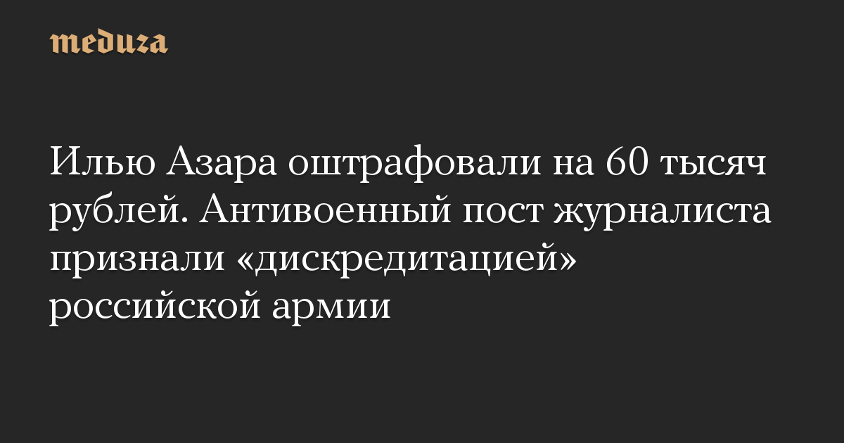 Хамовнический суд Москвы назначил штраф в размере 60 тысяч рублей журналисту «Новой газеты» Илье Азару по обвинению в «дискредитации» российской армии (часть 2 статьи 20.3.3 КоАП).