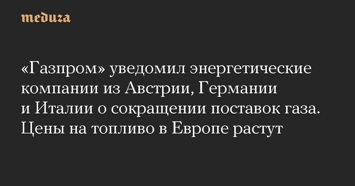 «Газпром» уведомил энергетические компании из Австрии, Германии и Италии о сокращении поставок газа. Цены на топливо в Европе растут