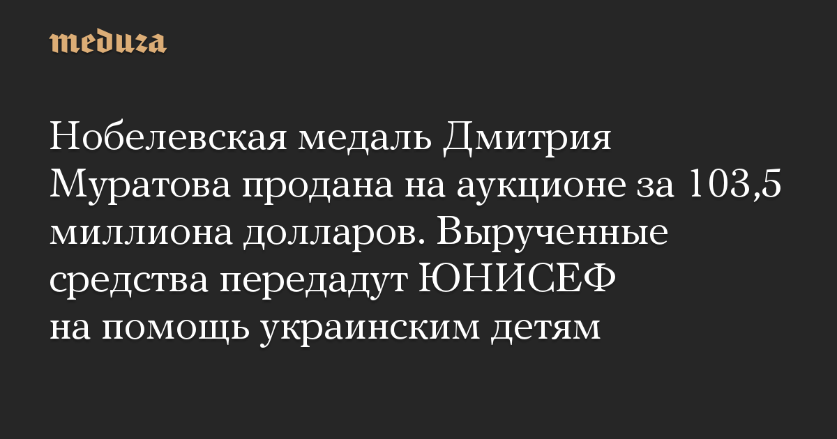Нобелевская медаль Дмитрия Муратова продана на аукционе за 103,5 миллиона долларов. Вырученные средства передадут ЮНИСЕФ на помощь украинским детям