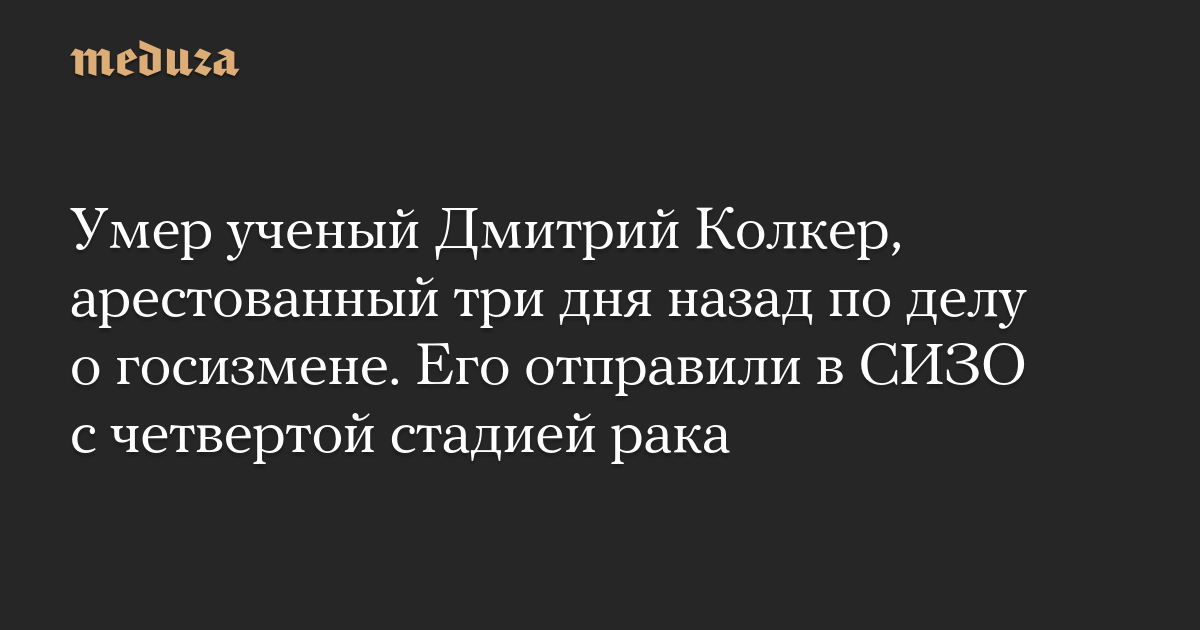 Умер ученый Дмитрий Колкер, арестованный три дня назад по делу о госизмене. Его отправили в СИЗО с четвертой стадией рака