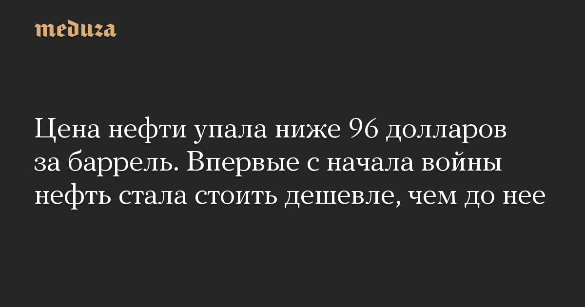 Цена нефти упала ниже 96 долларов за баррель. Впервые с начала войны нефть стала стоить дешевле, чем до нее