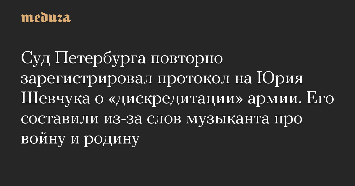 Дзержинский районный суд Петербурга повторно зарегистрировал административный протокол, составленный в отношении лидера группы ДДТ Юрия Шевчука по статье о «дискредитации» армии (часть 1 статьи 20.3.3 КоАП РФ). Об этом сообщила пресс-служба городских судов.
