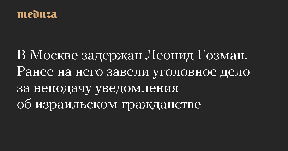 Обновление: Леонид Гозман сообщил, что его отпустили из полиции и «даже извинились, сказали, что это накладка». Как пояснил политик, по делу о неподаче уведомления об израильском гражданстве его объявили в розыске 12 июля, но 15 июля он сам пришел в СК и дал показания. «Я думаю, это просто бардак», — сказал Гозман телеграм-каналу «Можем объяснить».