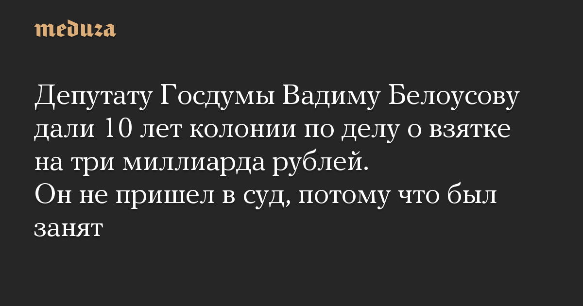 Депутату Госдумы Вадиму Белоусову дали 10 лет колонии по делу о взятке на три миллиарда рублей. Он не пришел в суд, потому что был занят