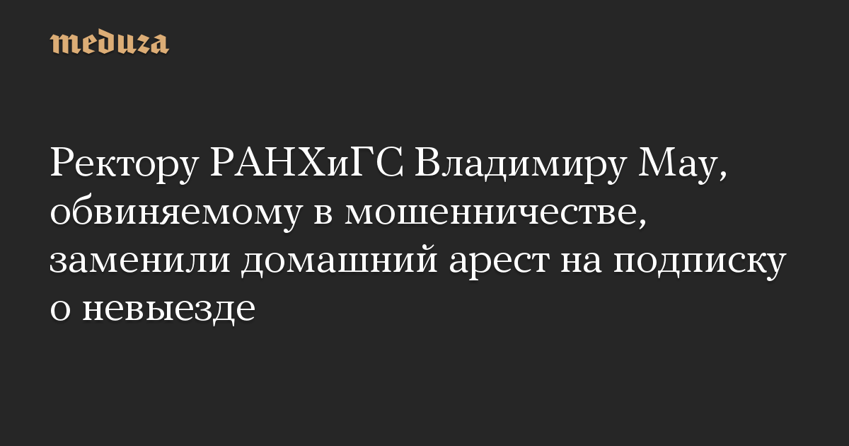 Ректору Российской академии народного хозяйства и государственной службы (РАНХиГС) Владимиру Мау, обвиняемому по делу о мошенничестве, заменили меру пресечения с домашнего ареста на подписку о невыезде. Об этом сообщил The New Times без ссылок на источники, а также собеседники «Русской службы Би-би-си» и РИА Новости.