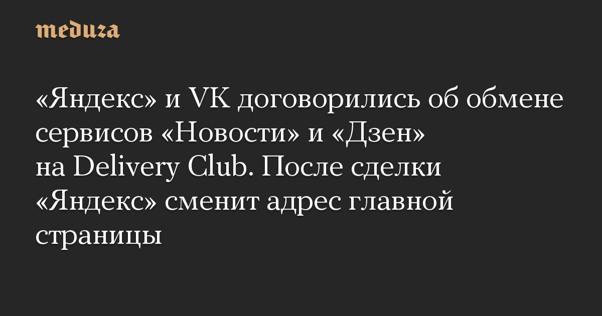 «Яндекс» и VK договорились об обмене сервисов «Новости» и «Дзен» на Delivery Club. После сделки «Яндекс» сменит адрес главной страницы