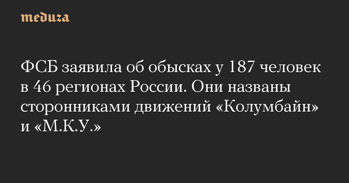ФСБ заявила об обысках у 187 человек в 46 регионах России. Они названы сторонниками движений «Колумбайн» и «М.К.У.»
