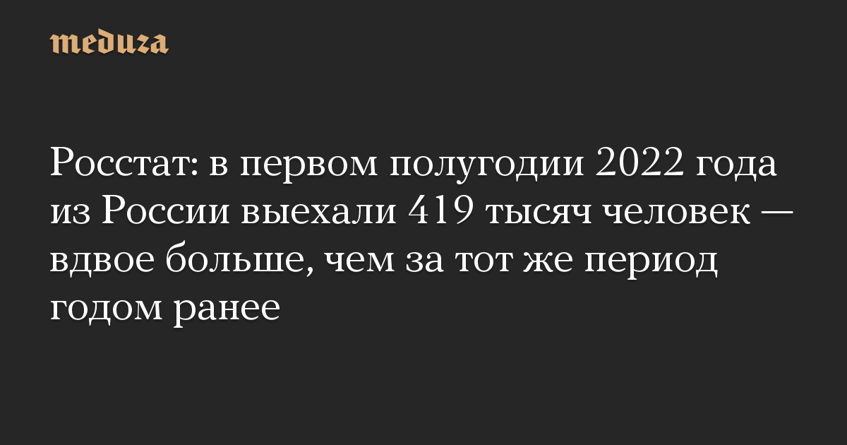 В первом полугодии 2022 года из России выехали 419 тысяч человек, сообщает РБК со ссылкой на данные Росстата. Это в два раза больше, чем за аналогичный период 2021 года, когда из страны выехали 202 тысячи человек.