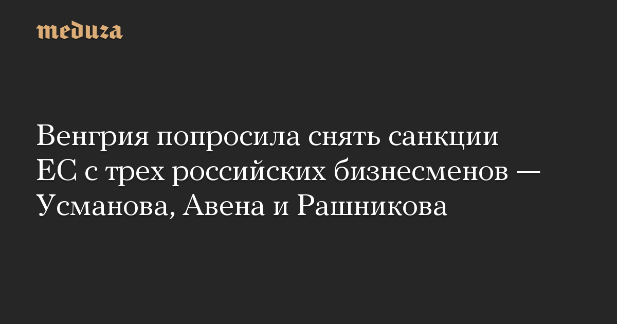 Венгрия обратилась с просьбой к Евросоюзу об исключении из санкционных списков трех российских предпринимателей — основателя USM Holdings Алишера Усманова, совладельца «Альфа-групп» Петра Авена и владельца Магнитогорского металлургического комбината Виктора Рашникова. Об этом сообщают Politico и «Радио Свобода» со ссылкой на нескольких европейских дипломатов.